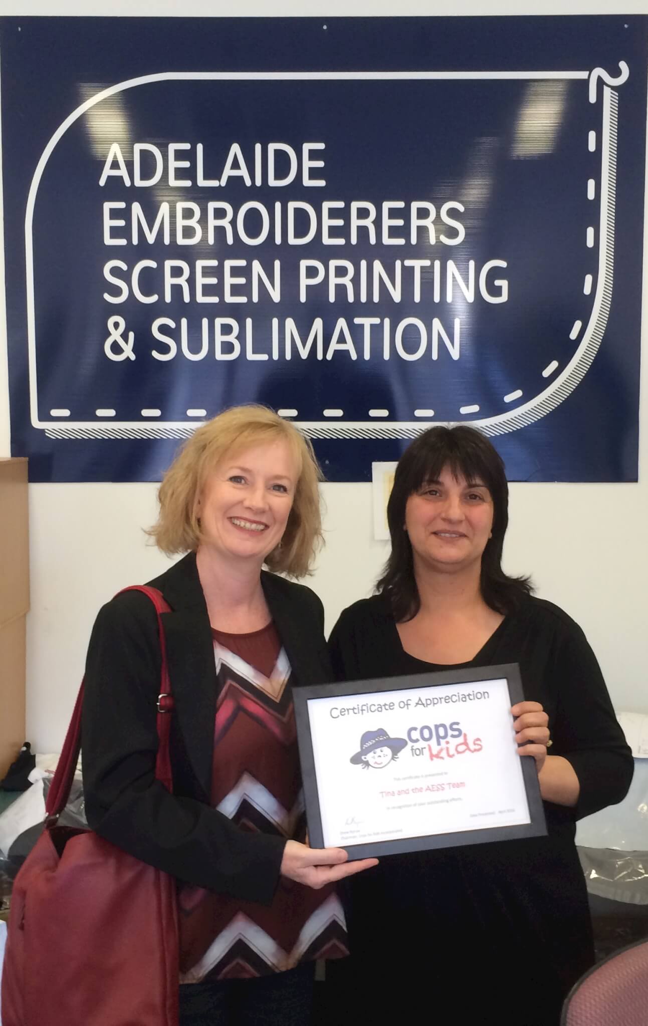 Cops For Kids would like to thank Tina and the team at Adelaide Embroiderers Screen Printing & Sublimation (AESS) for their help in producing the t-shirts used during the Fire Engine Pull. We had a very tight timeframe to organise the t-shirts and AESS came through with the goods. Not only were the staff incredibly helpful, we think the end result looked fantastic in the photos and on TV! We recently presented the AESS team with a certificate of appreciation. You can visit their website at adelaide-ess.com.au